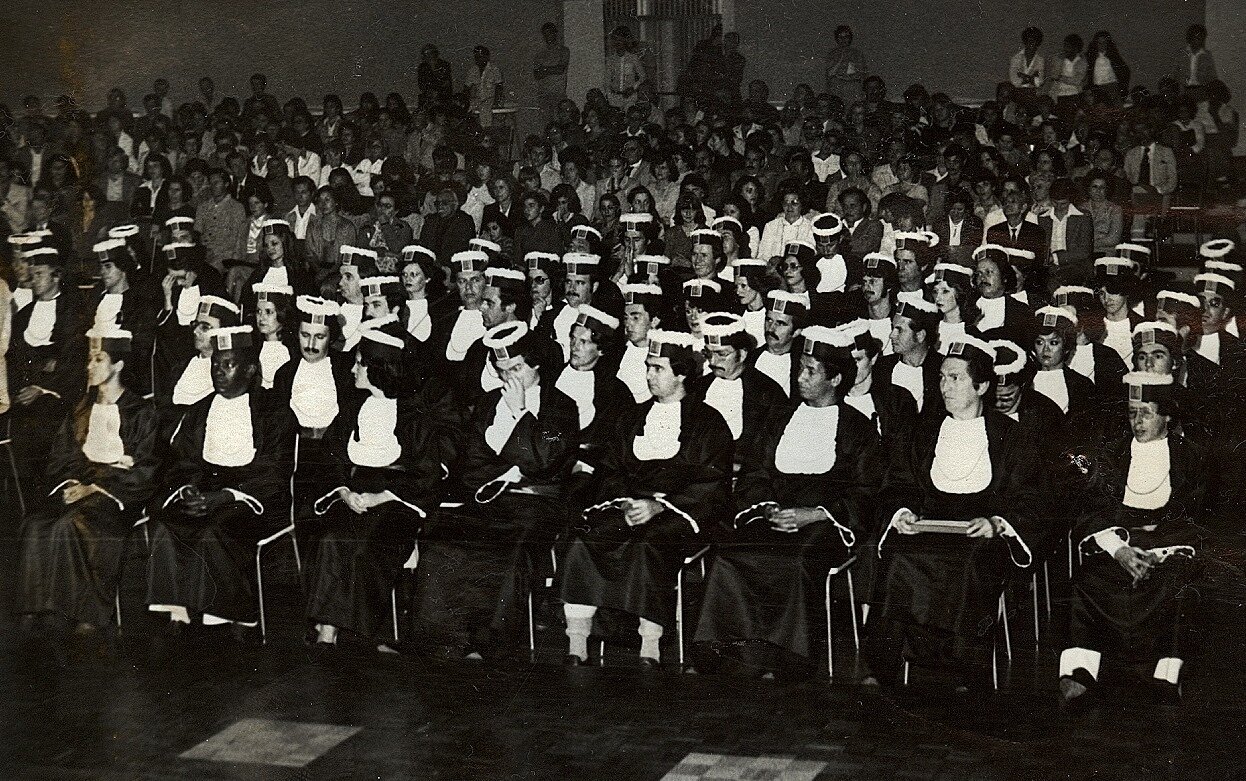 Do acervo de Xico Tebaldi, a fotografia mostra a Colação de Grau dos cursos de Administração e Ciências Contábeis da antiga Faculdade de Filosofia, Ciências e Letras de Cascavel (Fecivel), que mais tarde se transformaria na Unioeste. O registro é de 1982.
